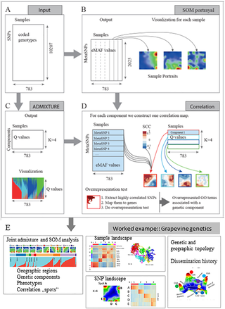 A) Input data is a G (SNPs) x S (samples) genotype matrix (10,207 x 783 in case of worldwide data) B) SOM training delivers a matrix of reduced dimensionality, where each meta-SNP is a cluster of single SNPs. Its value can be interpreted as the estimated mean eMAF (excess minor allele frequency) value averaged over the single SNPs in each meta-SNP. Each column (sample) is visualized as a SOM portrait by arranging the meta-SNP values in a square grid and coloring them according to their value in max-min scale from red (max) to blue (min). C) ADMIXTURE conducts population structure analysis and provides percentages (Q-values) of the genetic compounds. The analysis is done for a range of K, here for K = 4. D) Each Q-value profile is correlated with all meta-SNP profiles using Spearman’s Correlation Coefficient, ⍴(rho), providing a “correlation portrait” by coloring the correlation coefficients from red (max, i.e., positive) to blue (min, i.e., negative). Gene lists were extracted from areas of high values and used for GO function mining. E) Worked example presented in this publication: Combined admixture and SOM analysis is used to extract genetic components (see D). The SOM splits into a sample and SNP landscape which reflect the topology of the vine genome under different aspects.