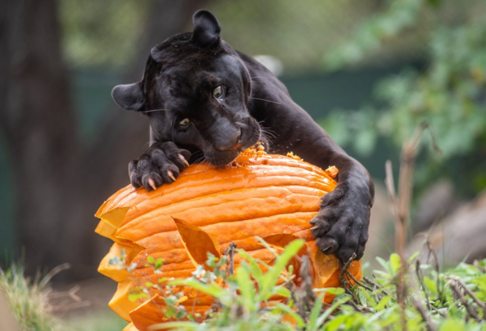 Among the first to enjoy their jack-o’-lanterns filled with appropriate treats were the big cat residents of the zoo, with the bobcat Bernice stalking her ghoulish prey while Ziggy, a black jaguar, tore into his treat.