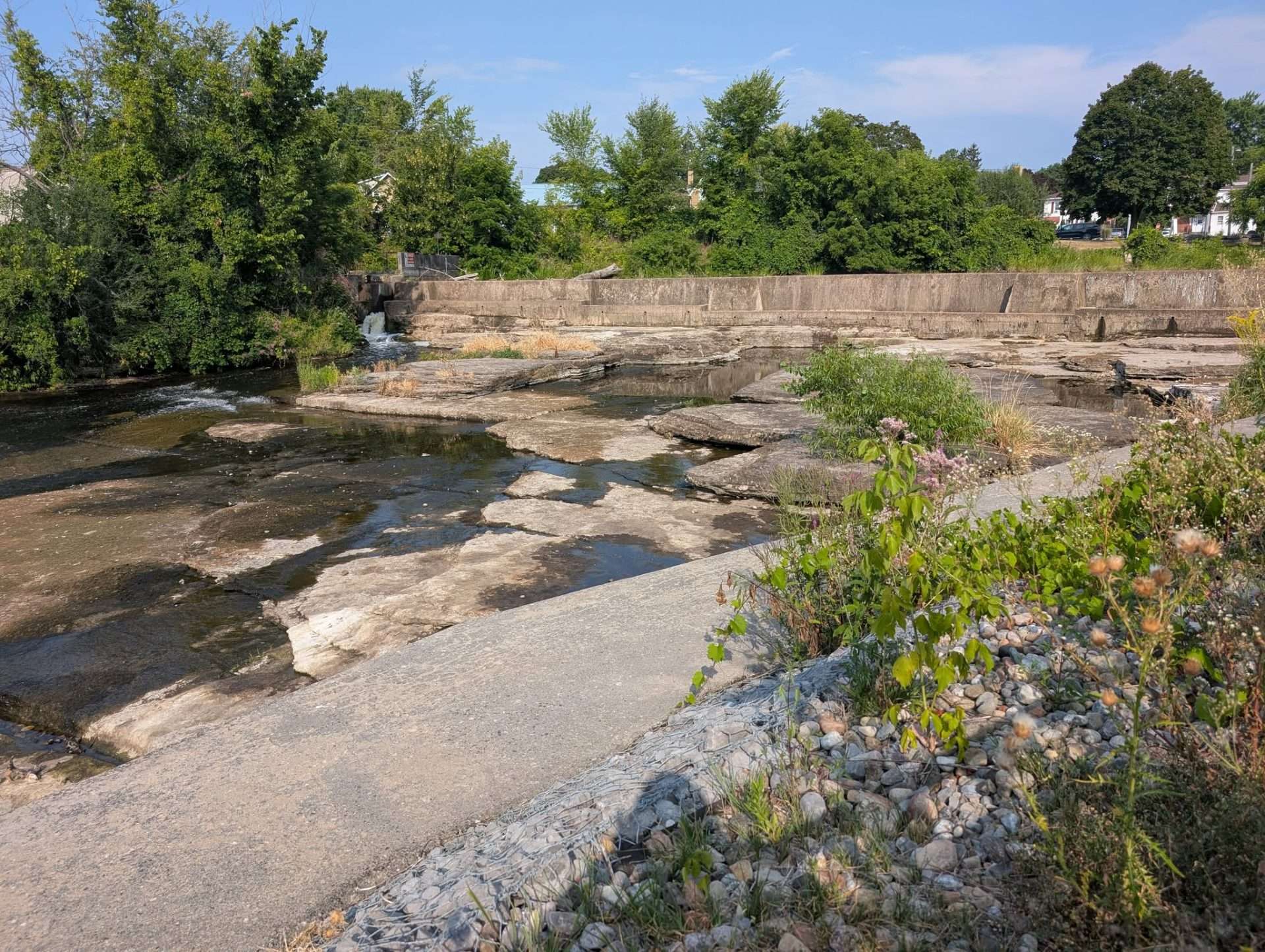 The Napanee Falls look quite dry on Tuesday, Aug. 12, 2025. Photo by Michelle Dorey Forestell/Kingstonist.