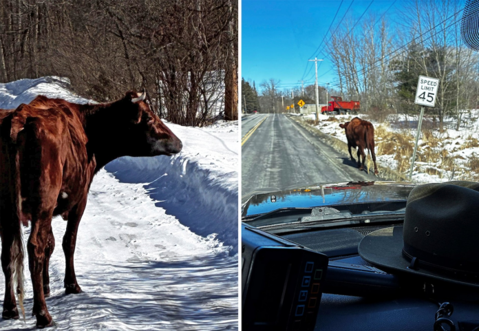 A bull escaped its pasture in the town Ticonderoga on March 1, catching the attention of New York State Department of Environmental Conservation police officer McCarthy who was patrolling Route 22.