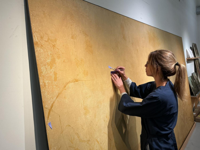The mural arrived in Minneapolis in a series of batches. A team of three conservators — Allexa Beller, Kristy Jeffcoat and Berg — have been diligently working on it.