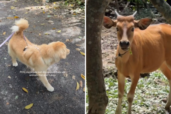 The video shared on Instagram on March 5 under the username @lanathegoldenretriever_ shows the puppy encountering animals she clearly doesn’t understand. From the very first moment, the young dog’s body language says it all. She backs away looking confused when she first sees a cow, cautiously trying to process what is happening in front of her.