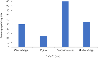 Among pooled samples from cats, 50% of fleas (C. f. felis) were positive for Rickettsia spp., with one sample confirmed as R. felis by sequencing (accession no MK509750). There were no positive result from ticks found on cats. In addition, 100% of C. f. felis pooled samples collected from dogs and cats, and 83.33% of C. f. orientis pooled samples collected from dogs were positive for Anaplasmataceae. Sequencing these as Wolbachia spp. in 50% and 33.3% of C. f. felis (collected from cats and dogs, respectively), and 16.6% of positive C. f. orientis collected from dogs (accession no CP051156) (Table 4). A total of five dogs had C. f. orientis positive for R. asembonensis, one of them also had fleas positive for Wolbachia spp., whilst 11.1% (1/9) dogs with Wolbachia-positive C. f. felis pools were also positive for R. felis. Of four cats identified with C. f. felis, one had fleas positive for R. felis (Table 5).