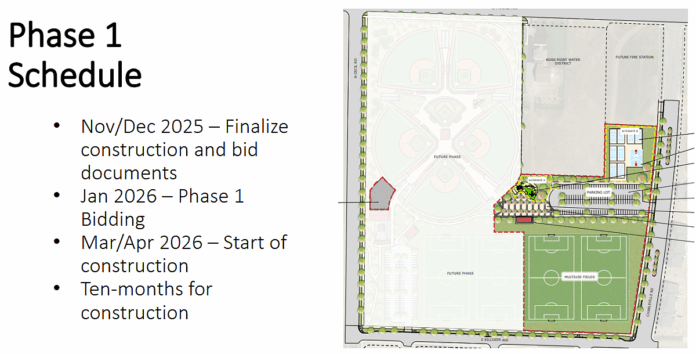 Robbie Quinn, city park planner, said phase one plans for the complex include two multipurpose fields, a parking lot, the restroom concessions building, an entry plaza and a maintenance yard.