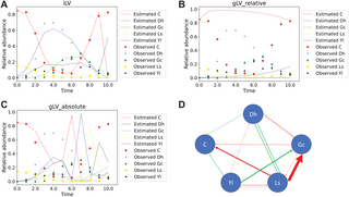 We set according to Table 7. Panels A, B, and C show the trajectories generated by iLV, gLV_relative, and gLV_absolute models, respectively, with observed data overlaid for comparison. iLV aligns closely with observed trajectories (RMSE = 0.149), whereas gLV_relative (RMSE = 0.327) and gLV_absolute (RMSE = 0.296) display higher errors. Panel D shows the predicted interaction network. The green arrows mean promotion, and the red arrows mean inhibition. The thickness of the arrows is proportional to the effect size of promotion or inhibition, indicated by the magnitude of bij. Only interactions that are at least 50 times larger than the minimum predicted interaction were plotted. Dh is D. hansenii, Yl is Y. lipolytica, Gc is G. candidum, Ls is Leucobacter sp., and C is a bacterial group composed of Arthrobacter arilaitensis, Hafnia alvei, Corynebacterium casei, Brevibacterium aurantiacum, and Staphylococcus xylosus.