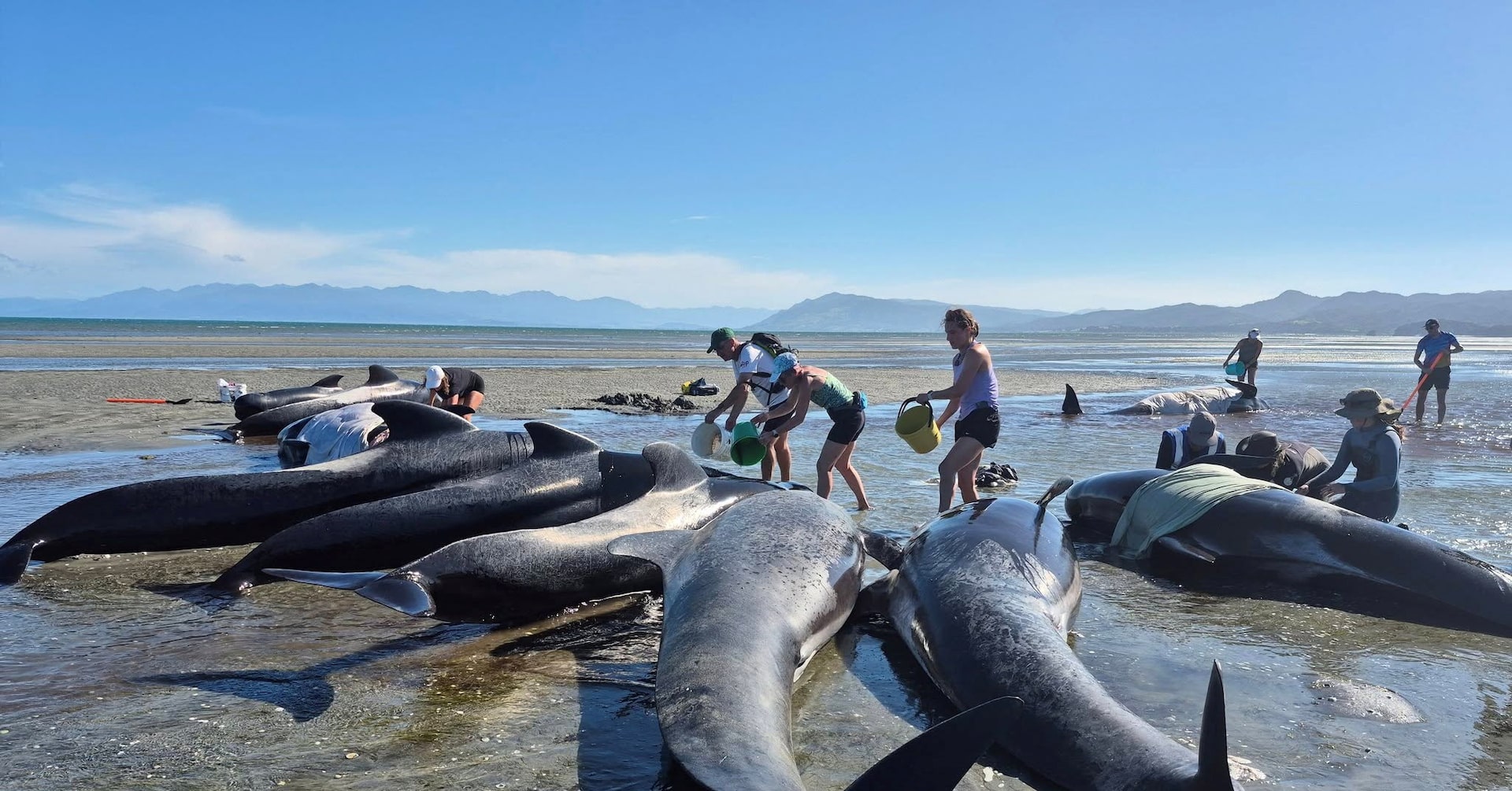 Project Jonah, in a statement on Facebook, said teams had been checking beaches across Golden Bay, where Farewell Spit is located, for other stranded whales and are working to keep the surviving animals cool and comfortable until the afternoon high tide.