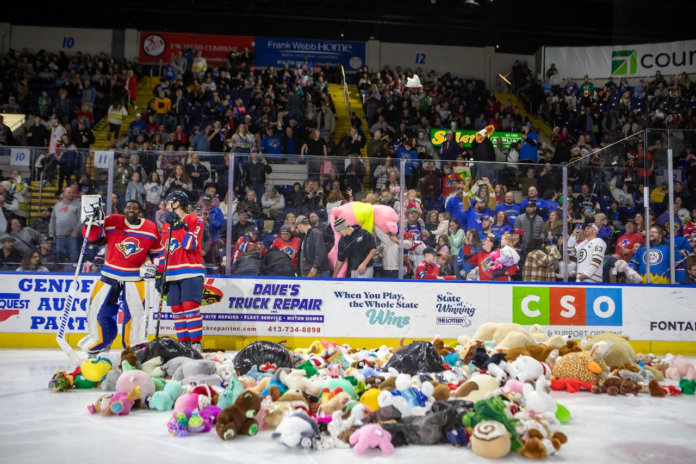 First introduced during the Thunderbirds’ inaugural season in 2016, the Teddy Bear Toss has now provided more than 40,000 stuffed animals to local charities, remaining one of the organization’s signature community initiatives and one of the most beloved holiday traditions in the Greater Springfield area.