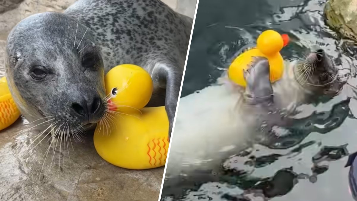 The routine recently drew attention on social media after the aquarium posted video of Reggae tightly hugging the duck while floating on his belly. In another moment, he sits on a rock with the duck tucked under his flipper, appearing to pat its head.