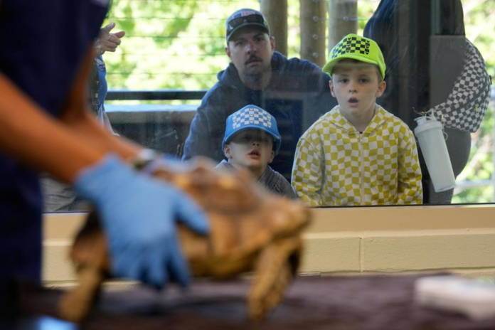 On a sunny Saturday in September, signs and announcements invited visitors to see the sulcata tortoise’s exam. The animal was brought to the zoo after being found on a New Jersey street, Fazio said. The reptile’s origins are unclear; sulcatas sometimes are kept as pets, though the state requires a permit for that.