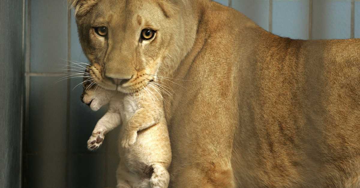 A lioness in the Aalborg Zoo in northern Jutland, Denmark, 11 October 2004, carries one of her newly born cubs in her mouth. Today was the first time the cubs and their mother were let out in their cage for the public to admire the little family. The… [2325 chars]